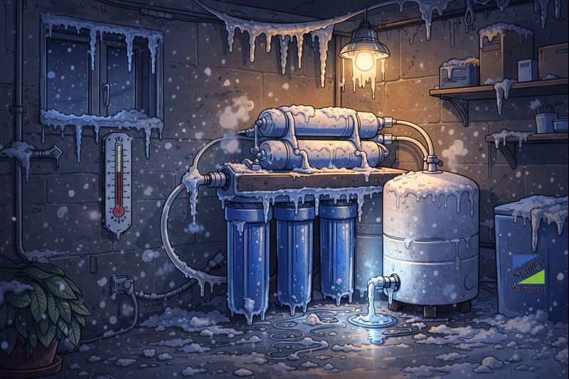 Обратный осмос — одна из самых чувствительных технологий. Мембрана, постфильтры и бак не допускают замерзания. Использование осмоса в холодном помещении без отопления категорически не рекомендуется.