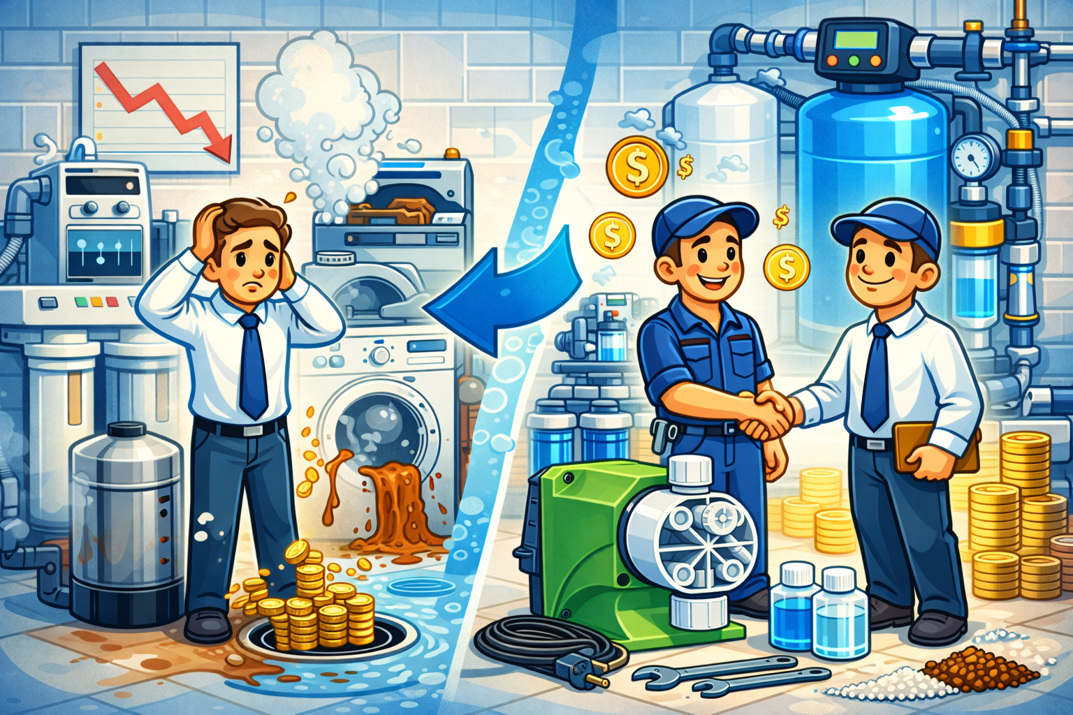 Нестабильное качество воды — скрытая, но одна из самых затратных проблем для бизнеса. Производственные предприятия, рестораны, отели, котельные, автомойки и коммерческие объекты ежедневно сталкиваются с последствиями жесткой, загрязнённой или химически нестабильной воды. Потери проявляются не сразу, но со временем приводят к серьёзным финансовым расходам.